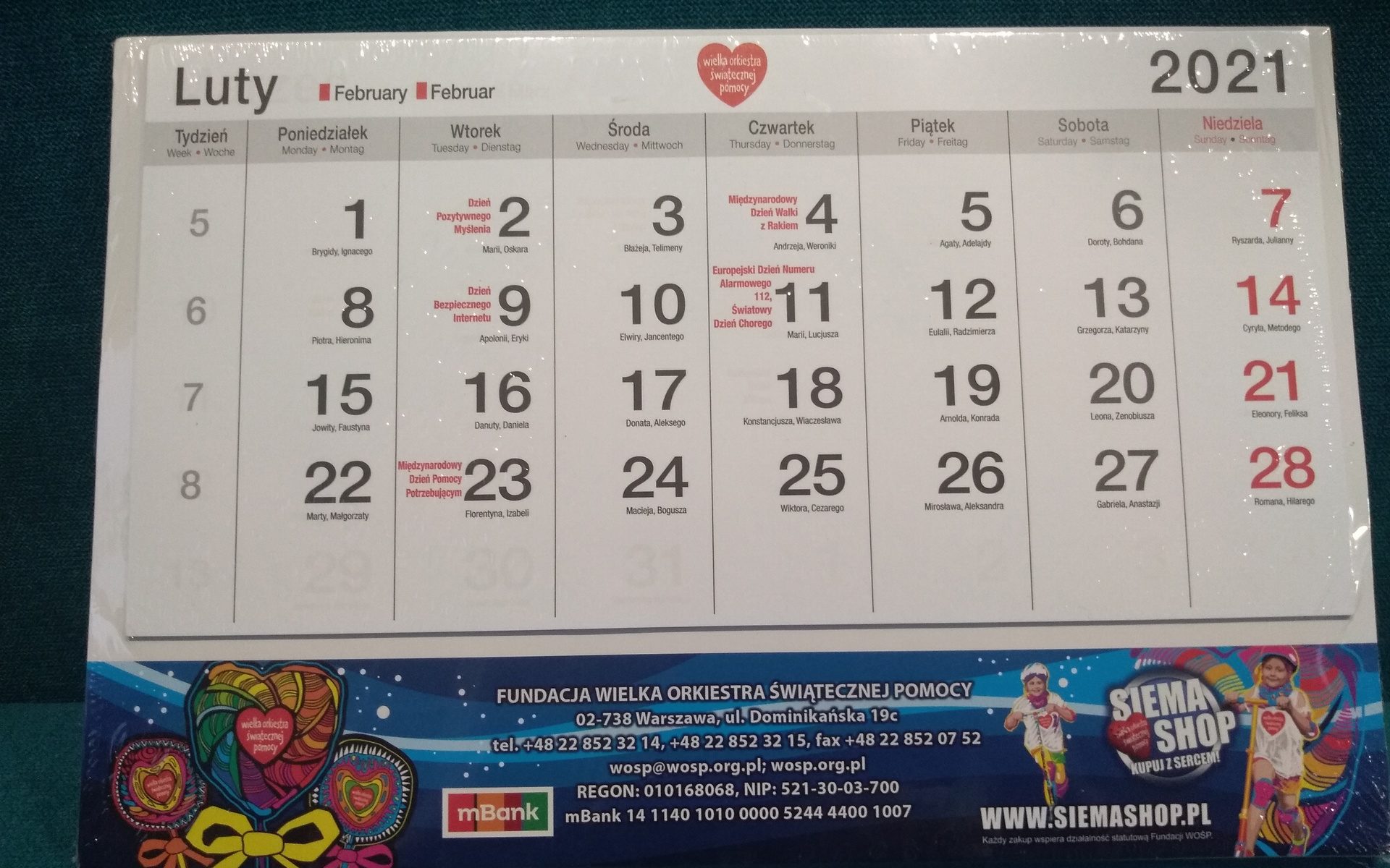 Kalendarz 3-rzędowy WOŚP – licytuj, podając swoją kwotę w komentarzach! Koniec licytacji w dniu Finału o godz. 10:00. Odbiór wylicytowanych rzeczy w dniu Finału do godz. 14:00 w remizie OSP Kieźliny.