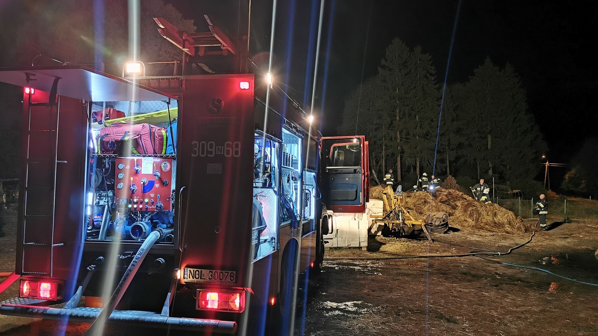 Czwartek, 5 września 2019 r. – o godz. 23:18 zostaliśmy zadysponowani przez Dyżurnego SKKM PSP w Olsztynie dwoma zastępami do miejscowości Zalbki – dogaszanie pogorzeliska z niedzieli (Alarm 097-098/2019), ponieważ w składowanym sianie ponownie pojawił się ogień. Na miejsce udaliśmy się zastępem 309-65 i 309-68 w pełnej obsadzie. W akcji uczestniczył także zastęp 302-25 z JRG-2. Działania zakończyliśmy ok. godz. 1:15.