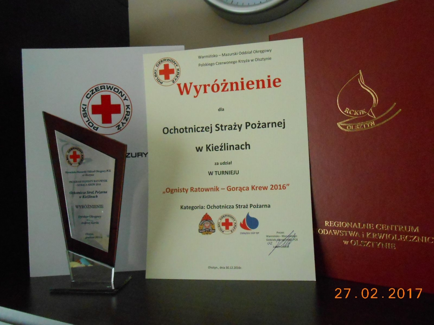 27 lutego 2017 r. w Komendzie Wojewódzkiej Państwowej Straży Pożarnej w Olsztynie odbyło się podsumowanie XI już edycji skierowanej do strażaków zawodowych i ochotników programu „Ognisty ratownik – Gorąca krew”. Krwiodawcom z OSP Kieźliny przyznano WYRÓŻNIENIE za 4 miejsce w edycji. Bardzo dziękujemy wszystkim strażakom oraz osobom wspierającym za wkład do naszego wspólnego sukcesu, którym jest POMOC POTRZEBUJĄCYM.